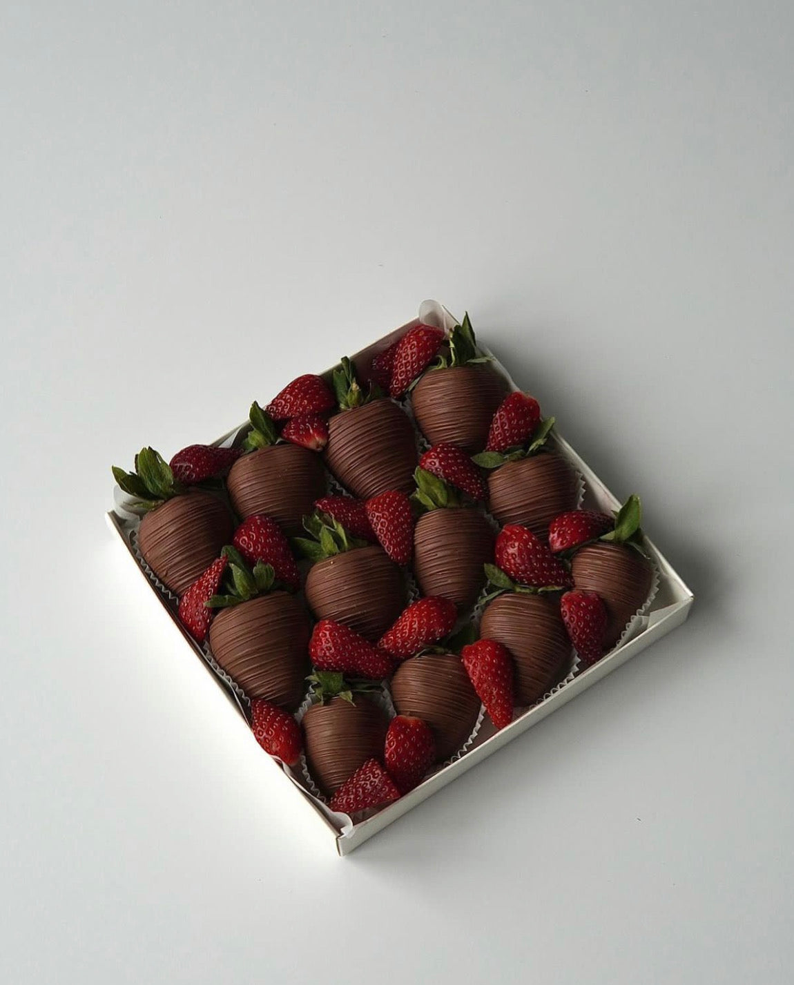 Swiss chocolate dipped strawberries arranged in a jox with strawberry slices in between in a giftbox